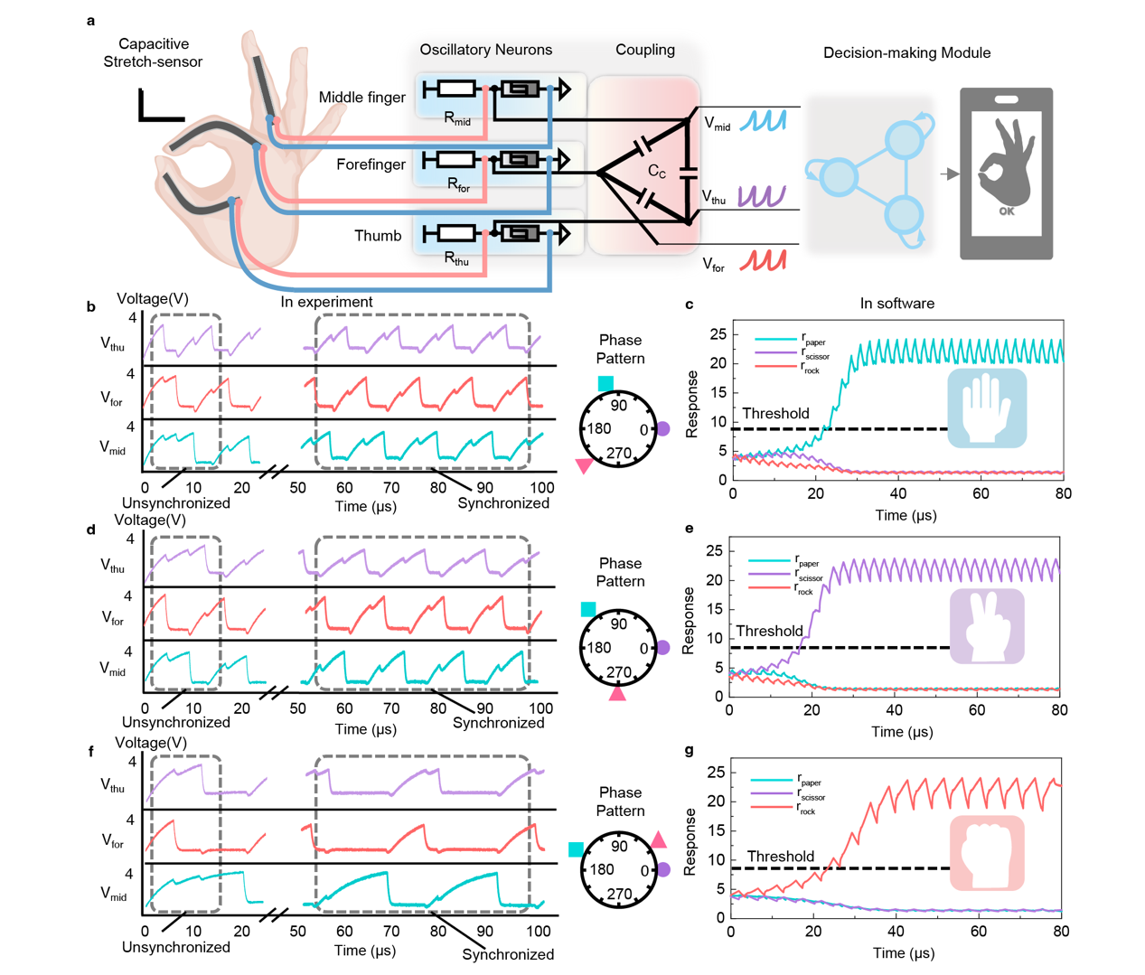 /集成电路高精尖创新中心杨玉超教授课题组首次硬件实现了电容耦合的VO2相变振荡动力学计算系统。传感数据遵循分层处理原则,包括传感预处理(编码、过滤和特征增强)到后处理(识别、分类和定位)。针对预处理模块,团队首先制备出具有高度均一性的氧化钒忆阻器件,并基于此构建具有传感功能的VO2振荡器。进一步利用电容电路耦合多个VO2振荡器构建出同步动力学特征,其中,信息被编码在同步后的相位差中。该耦合VO2振荡器网络用于构建传感预处理的连续时间动态系统,具有极低的能量延迟积。在后处理模块中,团队针对耦合振荡器连续时间输出的特征设计了具有高选择特异性的决策网络模块,从而构建出完整的动态传感与处理的计算系统。硬件实验结果证明了耦合网络在触摸识别和手势识别等感官处理任务中表现出色,相比传统的硬件实现在器件数目和能量延迟积等方面具有显著优势。
