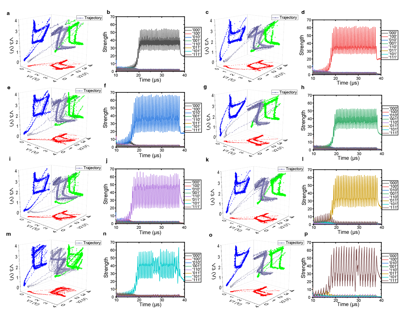 忆阻器耦合振荡动力学计算带来全新的计算特征,利用电路耦合将多个器件内部的物理动力学关联起来,在相空间中形成稳定的极限环轨迹。器件数目的增加带来计算空间的指数级提升,n个器件可以编码2n种模式。利用决策网络可以分辨出耦合振荡的特征模式,对动力学网络的输出进行读取。该研究为高效忆阻动力学计算系统提供了一种新的探索方向,有望推动高度紧凑的智能计算系统的进一步发展。