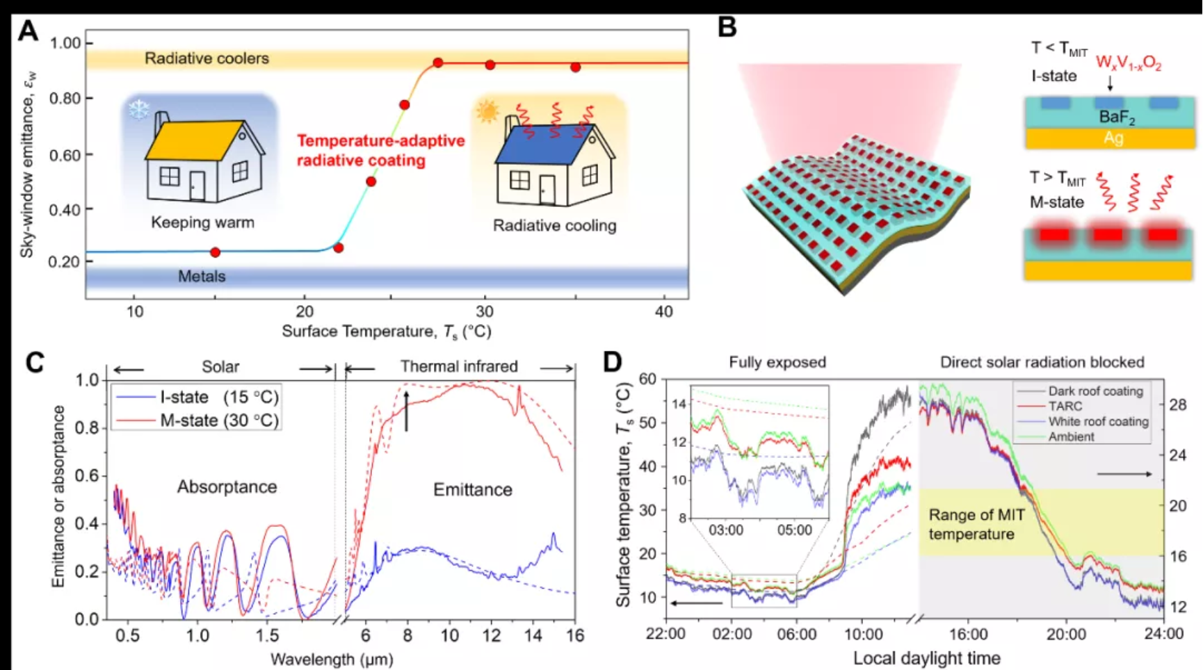 TARC的基本结构如图B所示,通过将氧化钒相变材料,钨掺杂技术以及超材料结构设计相结合,实现表面辐射率从高温时0.9到低温时0.2的自动切换(图C),有效避免了传统辐射材料低温时过度制冷的副作用问题。研究人员还可以根据不同地区的气候特点,针对性地设计TARC的阳光吸收率,使其在本地实现最优节能效果。此外,借助成熟的制造技术,TARC可以在柔性薄膜上加工,以广泛适应不同建筑物种类与应用场景。研究团队在户外环境中对TARC的智能辐射散热能力进行了实地测试,展现了符合预期的温度管理效果(图D)。
