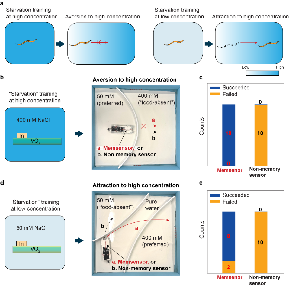 /集成电路高精尖创新中心唐克超研究员团队联合美国加州大学伯克利分校团队,开发出一种新型的无源忆感器(Memsensor)。该器件可通过材料表面的离子迁移速率感知液体中盐浓度,并将这种环境信息写入材料本身,实现无电源、可保持的“记忆”功能。忆感器由 VO2薄膜和紧贴其表面的铟(In)金属构成,利用固液界面的内建电场,在 Debye 长度范围内驱动 In³⁺注入 VO2表层,诱导 VO2发生由绝缘态向金属态的相变(图1)。器件的“感知”体现在电阻下降速率随盐浓度而变,“记忆”则源于掺杂引发的非易失相变,即使移除盐溶液后仍能保留电导状态。该研究不仅实现了感知与记忆功能的物理集成,还展示了其在仿生智能导航中的潜力。通过将多个忆感器加装于小船底部,团队实现了类似秀丽隐杆线虫(C. elegans)的基于“盐历史记忆”的化学导航行为,为水下机器人与环境智能交互提供了全新的低功耗解决方案(图2)。