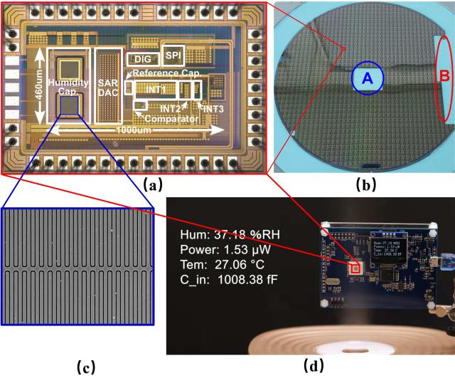 近期,北京大学黄如院士—叶乐副教授研究团队提出了动态电荷域功耗自感知技术和动态范围自适应滑动技术,并成功研制了一款国际领先的动态电荷域电容感知芯片,具有国际领先的感知精度和能效,可显著降低物联网节点的功耗水平。该芯片不仅打破了国外在相关芯片领域保持的综合性能世界纪录,还填补了国内在高能效电容感知芯片领域的空白。电容型模拟传感芯片作为应用范围最广的一类感知芯片,被广泛应用于湿度、加速度计、陀螺仪、压力、触控、压感触控、硅麦克风、接近感应等场景,具有重大的产业应用价值。研究团队针对其能效瓶颈问题,提出动态电荷域功耗自感知技术,解决了能量-信息转换率过低的难题,大幅延长了感知芯片的电池使用寿命。不仅如此,针对传统感知芯片可靠性差的问题,研究组提出了动态范围自适应滑动技术,解决了芯片抗干扰能力差和设计冗余过大的问题,显著提高了芯片的可靠性,使得该芯片即使工作在苛刻环境下(例如苛刻高低温环境、苛刻高湿环境、复杂电磁干扰场景等),性能也基本不退化。基于上述创新技术,研究团队基于国产CMOS量产工艺平台,通过后道兼容工艺在8英寸晶圆上实现了集成湿度传感器的电容感知芯片,并对晶圆各区域的芯片进行了大量测试,均取得了很好的性能一致性。该芯片的平均功耗仅1.5μW,可供8mm纽扣电池(42mAh)使用4年,感知精度高达17.9aF,综合性能指标FoM高达0.135pJ·%RH2;与当前国际同类工作相比,功耗降低了2倍,综合性能指标FoM提升了6倍。