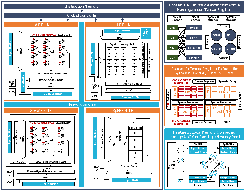 黄如院士-叶乐博雅特聘教授团队马宇飞研究员等,研制了一款基于稀疏-密集-静态-动态四象限异构张量引擎的通用AI加速芯片。该工作将AI算法中存在的矩阵乘法根据数据的稀疏性与动态性分为密集特征-权重矩阵乘法(FWMM)、稀疏特征-权重矩阵乘法(SpFWMM)、密集特征-特征矩阵乘法(FFMM)、稀疏特征-特征矩阵乘法(SpFFMM),并分别设计了针对性的异构张量引擎。此外,该工作利用了统一存储池技术与多发射技术进一步提升了芯片算力与能效。