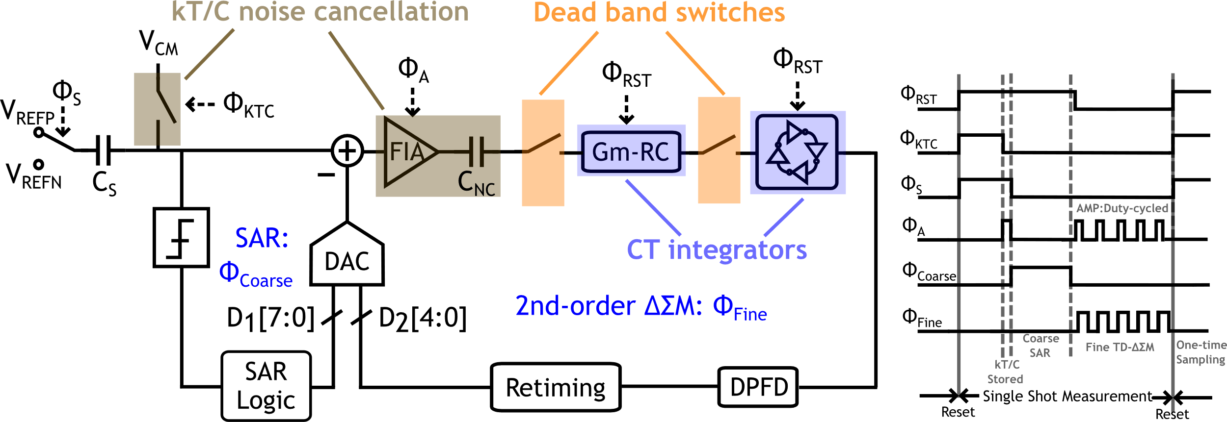 北京大学王源教授-唐希源研究员团队研制了一款增量型缩放式电容-数字转换器芯片。在架构方面,该芯片采用了SAR+二阶时间域ΔΣ的缩放式结构。二阶ΔΣ环路利用了带有串联电阻的Gm-C积分器,实现了低成本的前馈路径,保证了宽测量范围下的稳定性和较高的量化精度。在热噪声方面,该芯片采用基于浮动反相放大器的采样热噪声消除技术,突破其限制的精度瓶颈3.8dB。此外,该芯片设计了死区操作将CT环路转化为DT工作,解决了过量环路延迟问题,提供了一个可抵御环路系数变化的高鲁棒性ΔΣ环路。