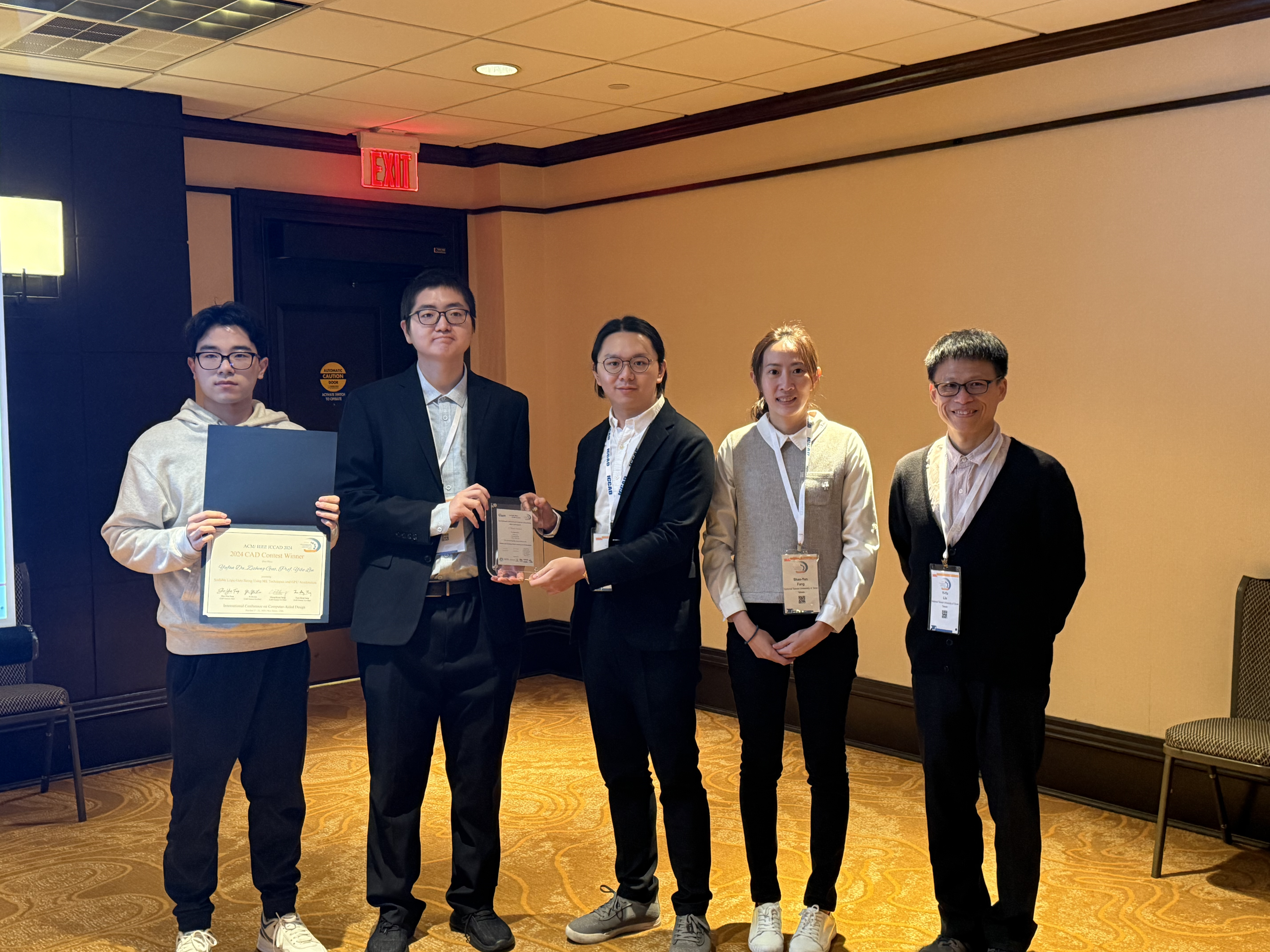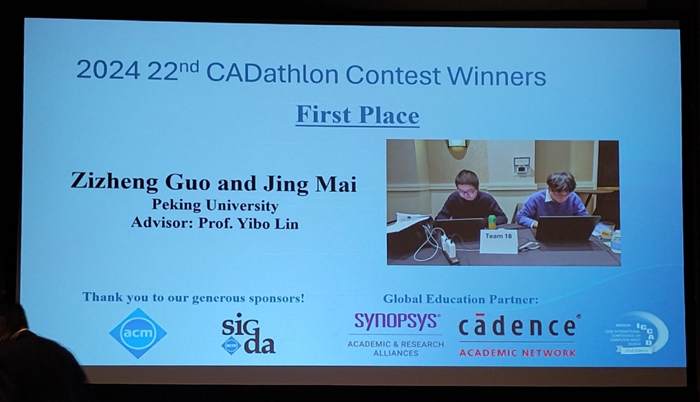 林亦波老师指导的博士生麦景、郭资政参加ICCADCADathlon编程竞赛获得第一名,本科生杜宇凡和博士生郭资政参加ICCADCADContest获得赛题三“ML/GPU加速逻辑门尺寸优化”赛道第一名。此外,杜宇凡和郭资政的论文《Fusion of GlobalPlacement and Gate Sizing with Differentiable Optimization》获得最佳论文提名。