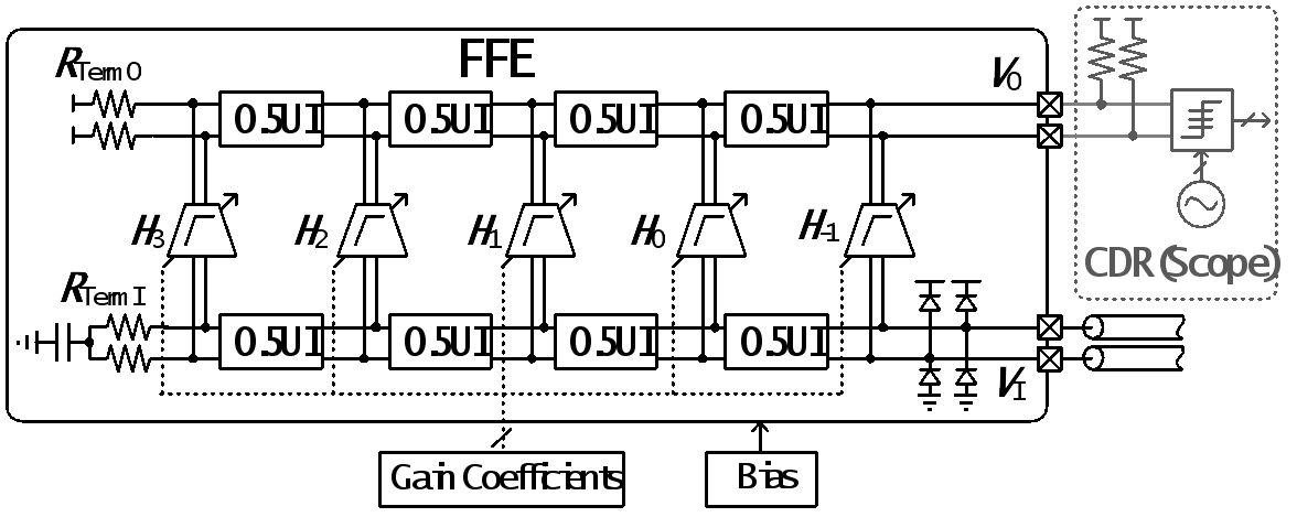 北京大学盖伟新-何燕冬教授团队提出了基于延迟线与分布式抽头的前馈均衡技术:该技术利用无源延迟线在超高速场景下损耗小的天然优势,解决了对模拟信号延时的功耗与噪声较大的问题,在实现200Gb/s超高速率均衡的同时,利用分布式结构降低了抽头负载电容引入的信号反射;此外,通过在抽头放大器中采用源极RC退化技术,赋予前馈均衡器灵活的低频均衡能力,避免仅靠增加抽头数量来消除长尾码间干扰,大幅降低了电路功耗。