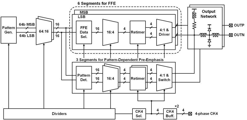北京大学盖伟新教授团队从电路设计和均衡机制方面入手,提出了可编程宽度的脉冲发生器,依靠脉冲宽度调节驱动器增益,从而实现最快信号翻转速度,减小信号边沿在码元宽度中占据的比例,改善眼宽;提出了基于码型的预加重均衡机制,通过检测电路对待发送的信号码型实时监测,在特定信号处以注入电流的方式加强信号,消除码间干扰的同时避免输出摆幅衰减。