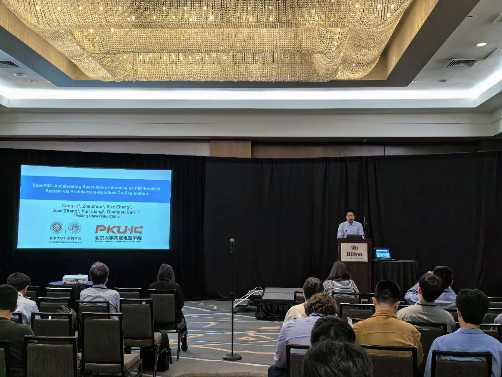 大语言模型的自回归解码是其进行文本生成的严重瓶颈。为了加速解码过程,投机采样推理引入了更轻量的草稿模型,通过“草稿模型解码-大语言模型验证”的方式加速文本生成。然而,在投机采样推理中,不同模型执行着不同的运算模式,并且需要同时对计算密集算子和访存密集算子进行加速,这些特点使得现有系统无法充分发挥投机采样推理的加速潜力。为了缓解这一问题,孙广宇团队提出了一种基于DRAM近存计算架构的异构加速器软硬件协同设计方法。在硬件设计上,该方法探索最适合每种模型的近存计算架构配置。在软件设计上,该方法不仅优化了不同模型之间的协作数据流,还优化了每个模型在异构硬件上的执行数据流。该工作以《SpecPIM: Accelerating Speculative Inference on PIM-Enabled System via Architecture-Dataflow Co-Exploration》为题发表(博士生李聪为第一作者,孙广宇副教授为通讯作者)。