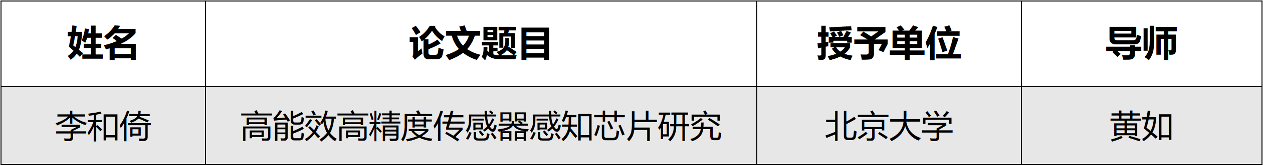 2020级博士生(导师黄如),主要研究方向为高能效数模混合集成电路设计、高能效高精度传感接口集成电路设计等。目前已在芯片设计奥林匹克ISSCC、芯片设计国际顶刊JSSC、电路与系统国际顶刊TCAS-I、TCAS-II、CICC、ASSCC、MWCL等学术会议和期刊上发表论文22篇。作为第一作者,曾获芯片设计奥林匹克ISSCC 2021年度最佳芯片展示奖(Demo Award),该奖项为ISSCC自1953年创办以来国内首次获奖,曾获SSCS国际固态电路协会最佳博士成就奖,该奖项是国际芯片研究领域在读博士生的最高学术荣誉,也是北大学生首次获奖,曾获2021年度ISSCC 亮点(Highlight)论文、2021年度中国半导体十大研究进展;合作获得2023年度ISSCC最佳论文奖(ISSCC Anantha P. Chandrakasan Distinguished-Technical-Paper Award),这是ISSCC自1953年创办70年以来国内(含港澳地区)首次获奖;此外,还获得过北京市优秀毕业生、北京大学校长奖学金、北京大学五四奖学金、北京大学国家奖学金等荣誉。