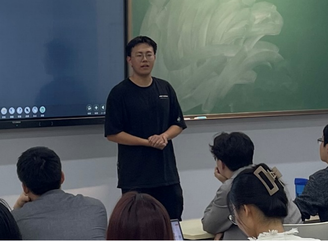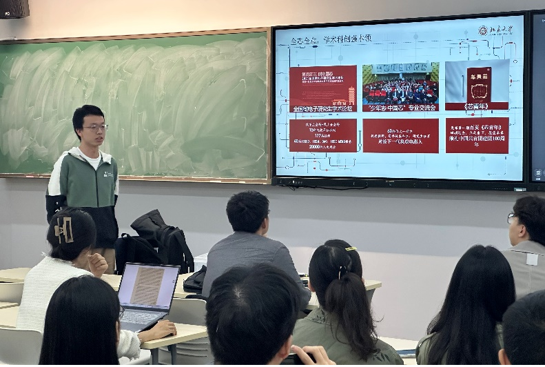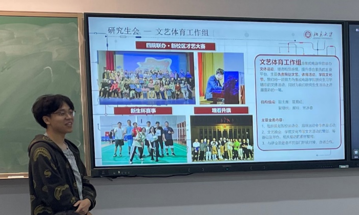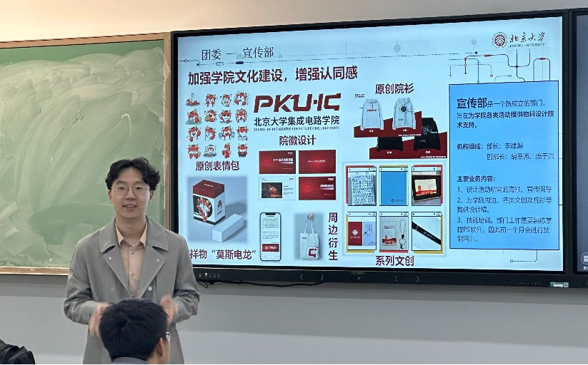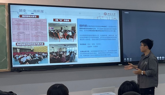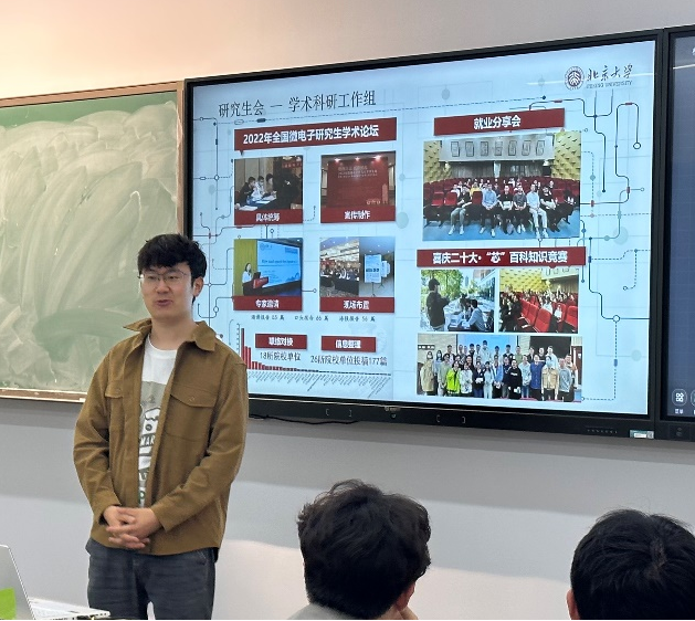 学术科创部部长杨佑铭介绍了学术科创部承担的各类学术交流活动的组织与筹备工作,包括全国微电子研究生学术论坛,并与校团委、其他院系交流合作,协助举办和宣传挑战杯、互联网+等学术赛事,以及模拟面试、企业参访等校企合作活动。