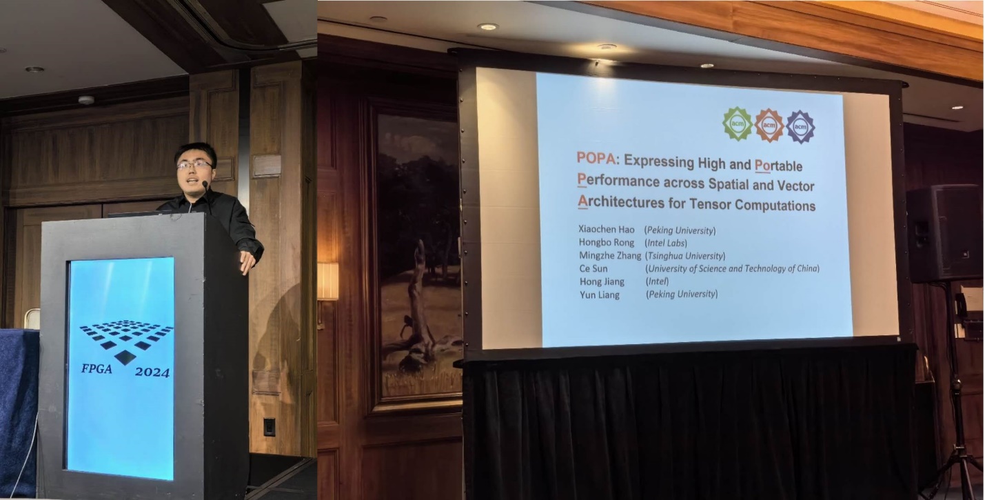 该工作以《POPA: Expressing High and Portable Performance across Spatialand Vector Architectures for Tensor Computations》为题发表,由文章第一作者博士生郝晓辰进行宣讲,文章的通讯作者为梁云教授。