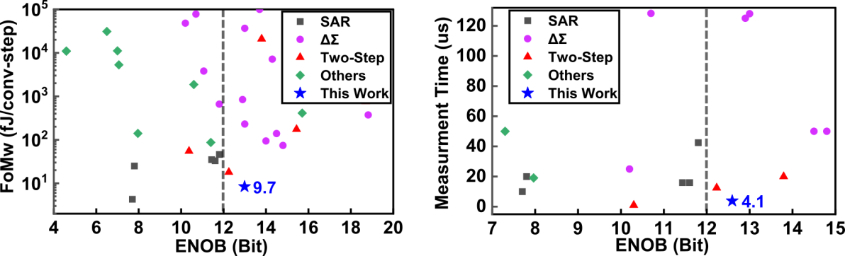 基于上述技术,课题组研制了一款基于28nm CMOS工艺的时间域增量型缩放式电容数字转换器芯片。该款芯片只需要单个传感器测量硬件,实现了1次采样10次量化的电容-数字的转换。该电路实现了0-5pF电容值测量范围,信噪比达到了77.7dB。在所有高精度(12-ENOB以上)电容数字转换器中实现了最低的测量延迟(4.1us)和最高的能效水平(9.7fJ/conv.-step)。该芯片的高精度、高能效、低延迟等特点,使其能够广泛应用于各类物联网传感器前端。