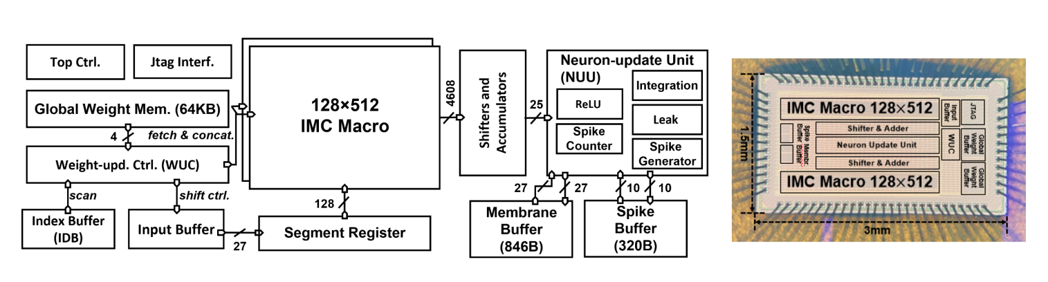 香港六合彩玄机 黄如教授-叶乐教授团队研制了一款高能效混合架构脉冲神经网络芯片。通过在算法、架构和电路层面进行创新,该芯片可以同时实现了同类工作中最好的能效和高精度。在算法层面上,该芯片结合了反向传播算法和时空反传播算法(STBP)来训练网络,利用SNN来提取时间维度信息、提高了识别精度并减小了ANN网络规模。在架构层面上,该芯片具备高细粒度的可配置性,可以同时支持SNN神经元,ANN神经元以及SNN到ANN的转化过程,并根据脉冲稀疏性动态调整权重存储和工作负载。在电路层面上,课题组提出了功耗自适应输入稀疏性的存内计算阵列电路,其计算能力与输入和权重的稀疏性成正比,适用于具有ReLU激活的ANN和SNN中的稀疏操作。