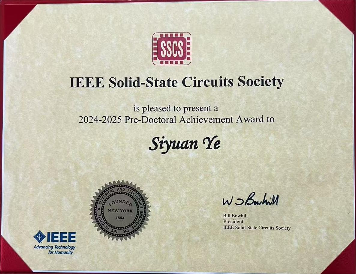 SSCS Predoctoral Achievement Award(国际固态电路协会博士生成就奖),每年2月中旬在美国旧金山召开的ISSCC会议上进行颁发。该奖评审委员会由国际工业界、学术界知名专家共同组成,用以表彰全球集成电路设计领域杰出的在读博士生。