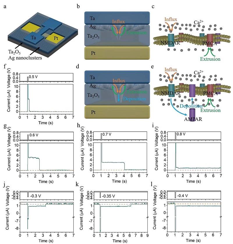 在生物突触中,Ca²⁺的迁移在STP和LTP中起到关键作用,是形成记忆和学习的基础。类似地,该器件中Ag纳米团簇起到了类似突触中Ca²⁺的作用。比如,低振幅的单脉冲只能将少量的Ag激发到电介质中,这类似于Ca²⁺离子的内流过程,还可能形成一个弱导电通道。在施加脉冲使得Ag进行电化学迁移之后,Ag细丝表面能的热力学最小化驱动桥接Ag纳米团簇从电介质中逸出,这类似于Ca²⁺离子通过质膜的外流过程。这些过程也得到了电镜图像的证实。可以说,电场作用下,Ag纳米团簇在电介质中的电化学迁移和热力学弛豫彼此竞争,模拟了生物学中的突触动力学,是该人工突触器件实现STP/LTP的机制,并可用于模拟生物神经元的累积、泄漏、发放动力学过程,从而在同一种器件当中实现了突触、神经元的功能。