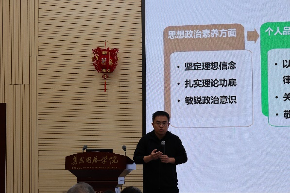 青年教师基本功大赛课程思政奖获得者郑雨晴老师、马宇飞老师分享了他们的课程思政教育心得。郑雨晴老师就思政教育是什么、如何进行分层次的思政教育以及面对不同的学生群体如何进行思政教育等内容进行了分享。马宇飞老师从人工智能芯片课程出发,分享了人工智能芯片如何与思政教育相结合的看法。青年教室贺明老师随后也分享了自己在授课过程中对思政教育的一些思考。