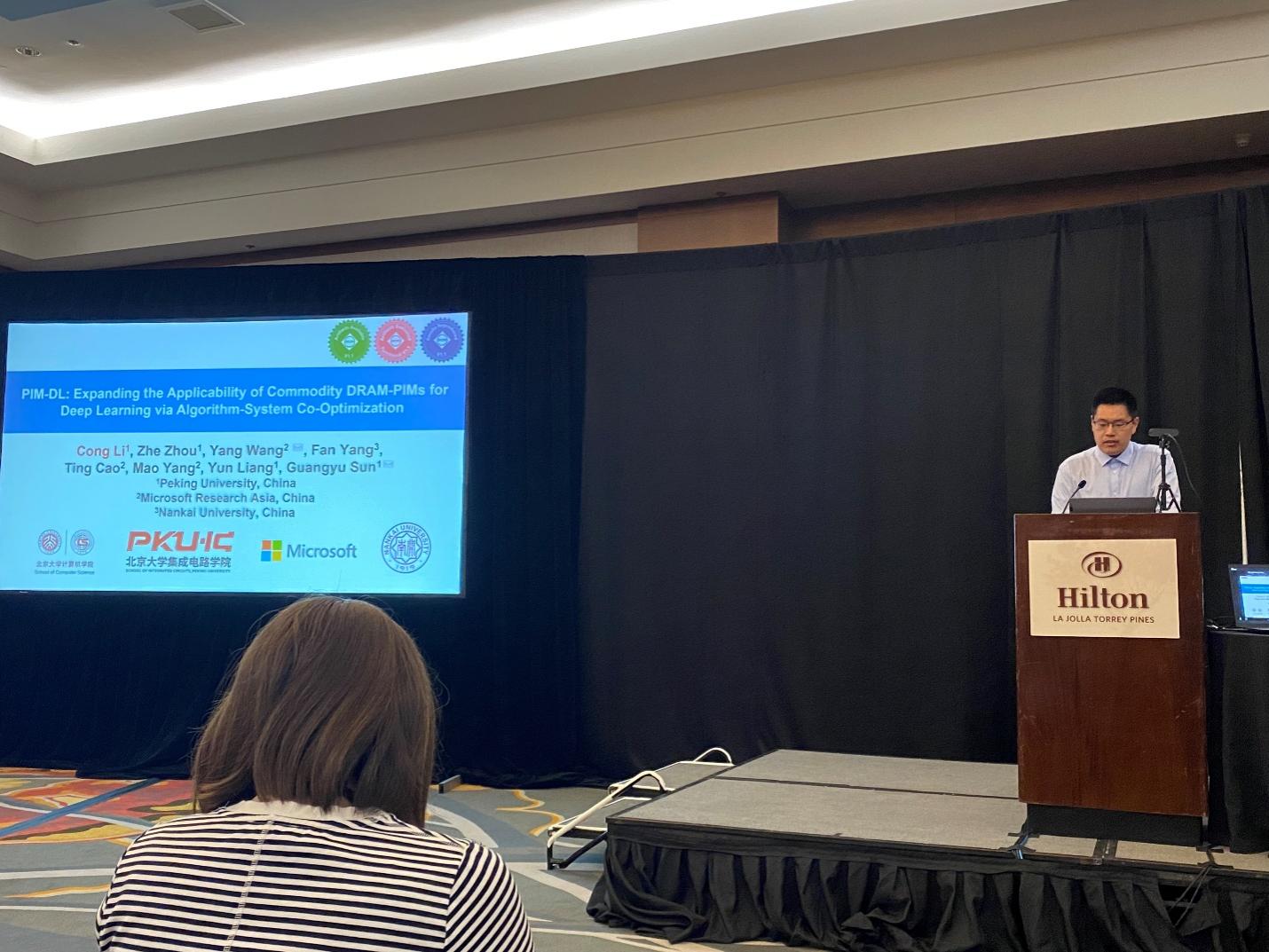 近年来,基于DRAM的近存计算商用产品被UPMEM、三星、海力士等公司提出。然而,现有商用存计算架构的低算力限制了它们在深度学习场景的应用范围,使其只能处理延迟占比较小的逐元素算子和矩阵向量乘算子。为了缓解这一问题,孙广宇团队与微软亚洲研究院合作,为商用DRAM近存计算平台进行了算法层与系统层的协同优化。作者们改进了对DRAM近存计算架构友好的LUT-NN算法,并对其在DRAM近存计算架构上的执行进行了数据流优化,并进一步将上述设计在UPMEM的商用硬件上进行了原型实现。该工作以《PIM-DL: Expanding the Applicability of Commodity DRAM-PIMs for Deep Learning via Algorithm-System Co-Optimization》为题发表(博士生李聪为第一作者,孙广宇副教授和微软亚洲研究院王阳研究员为共同通讯作者)。