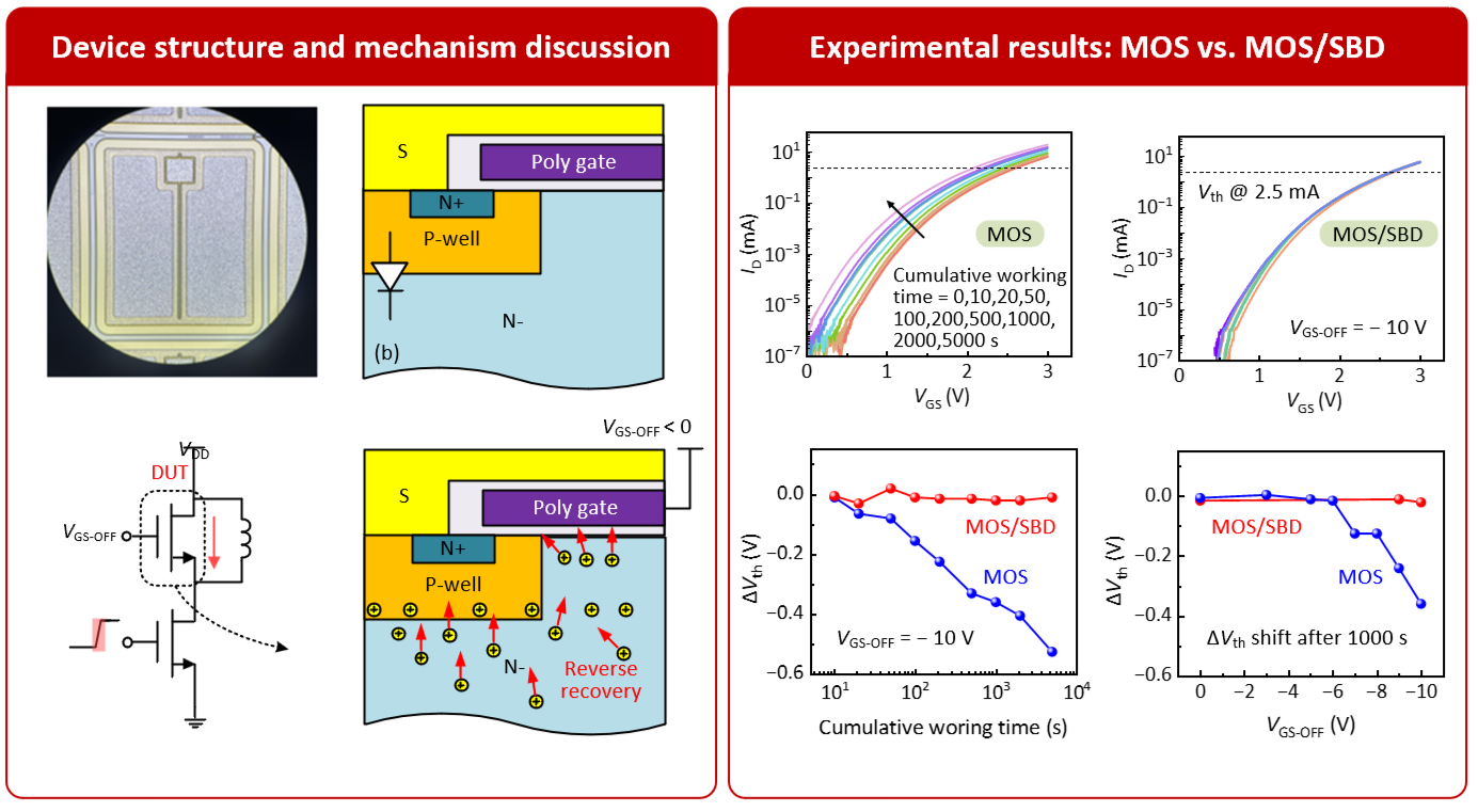 目前,SiC功率器件已在商业领域取得重大成功,但受限于当前的氧化工艺导致的较高界面陷阱,以及SiC/SiO₂界面较小的带隙差,使得阈值电压Vth不稳定性成为SiC MOSFET的一个突出难题。在同步整流等实际应用场景中,续流二极管是必不可少的元件。一方面,相比反并联肖特基势垒二极管 (SBD),SiC MOSFET内置的体二极管凭借其更高的成本效益展现出显著优势。另一方面,为了抑制SiC MOSFET误开启现象,常使用负的栅极电压将器件关断。北京大学魏进研究员团队通过深入研究首次发现,在体二极管导通状态下施加负的栅极电压关断器件时,会引发显著的阈值电压负漂移现象。