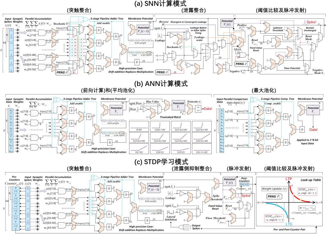 本文围绕神经形态计算中存内计算和脉冲神经网络两条关键技术路线,基于铁电晶体管(FeFET)的特性进行了器件-电路-算法的协同设计,在降低硬件开销、提升能效的同时实现了功能拓展。面向非易失性存内计算系统,首次结合时间域计算的优势,提出一种基于FeFET的新型混合信号存内计算系统。进一步,针对边缘端非易失性系统的硬件安全问题,对加密算法和硬件进行协同设计,提出一种基于新型铁电隧穿场效应晶体管的加密存内计算系统,在增强安全性的同时能提升面积效率和能效。另一方面,面向仿生脉冲神经网络,首次提出利用双向铁电极化翻转模拟兴奋和抑制的动态,实现了一种基于新型FeFET的脉冲神经元。进一步基于FeFET实现了新型自适应随机脉冲神经元和有符号突触,显著降低脉冲神经网络系统的硬件开销。以上工作为神经形态计算系统的大规模硬件集成和高级功能的实现奠定了基础。