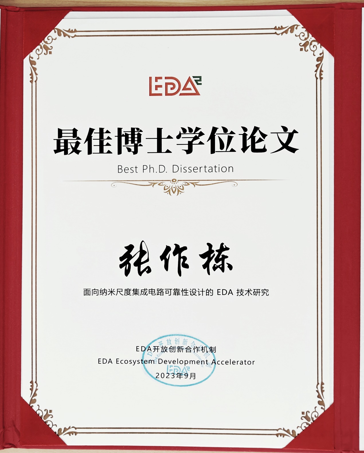 近日,EDA开放创新合作机制(EDA2)将2023年度“最佳博士学位论文”授予香港六合彩玄机 毕业生张作栋博士,并于9月17日在EDA开放创新合作机制年会上颁发。