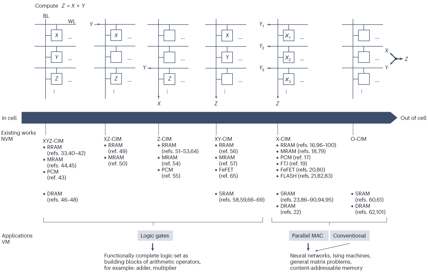 近年来,面向人工智能等数据密集型应用,为了突破芯片算力瓶颈,后摩尔时代新器件和计算架构成为了芯片发展的研究重点。其中,存内计算作为一种新型计算技术,得到了学术界、工业界的广泛关注与大量研究投入。相关研究方向包含从基础电子器件到高层级架构、大规模系统等各个层级,从成熟硅基存储器到新兴阻变存储器等各类元器件。尽管名称相同,不同类型存内计算技术的基本原理存在很大不同,具体取决于:1,输入操作数是否由存储单元原位提供;2,计算输出是否原位回存至存储单元;3,输入/输出数据是易失性的还是非易失性的;4,输入/输出数据是否以相同的物理变量表示。这些差异使得人们很难对不同存内计算技术形成包容性的全面了解,也阻碍了学术界和工业界不同领域(如半导体器件、IC设计、计算机体系结构等)之间的理解与沟通。