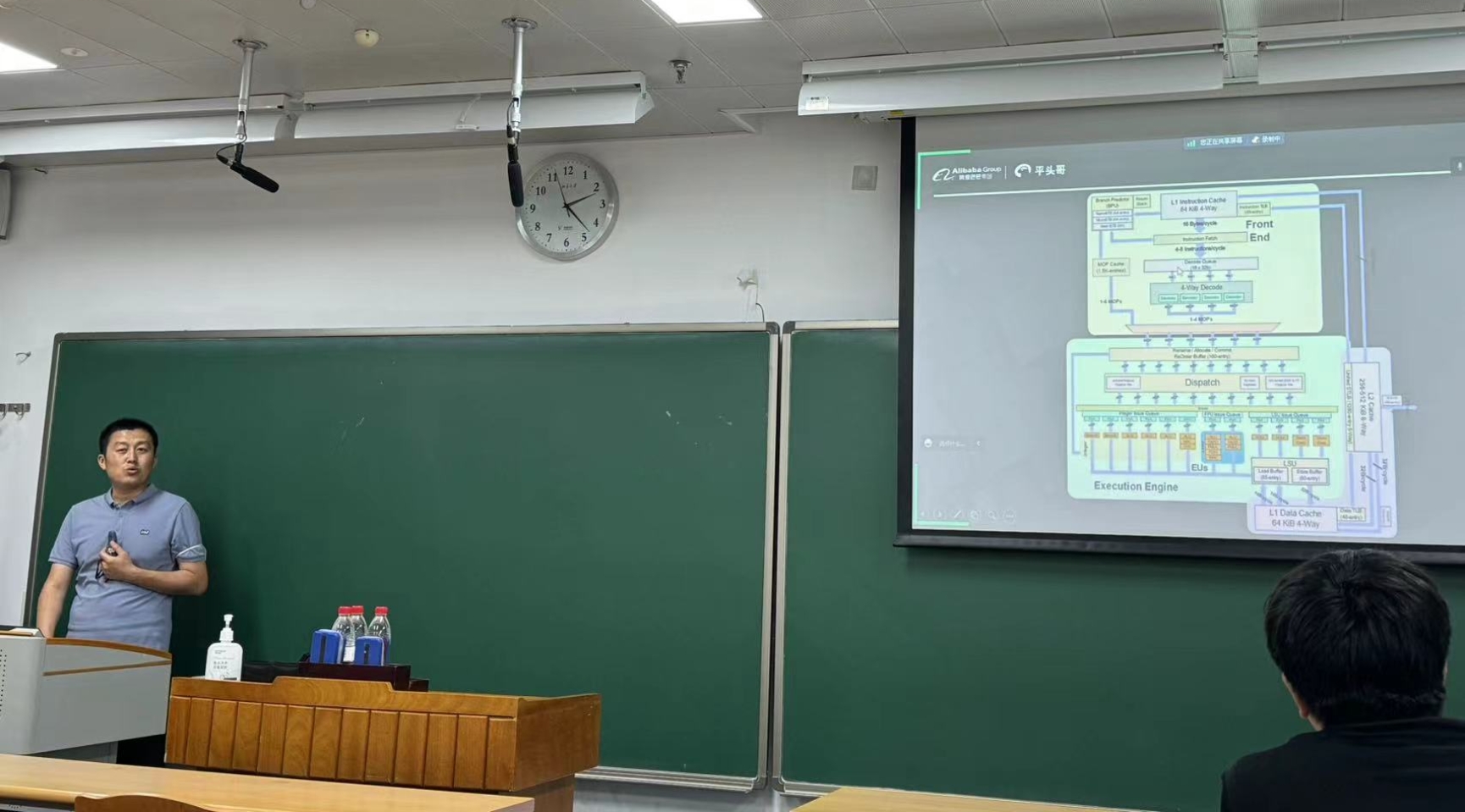 孙浩以产业界一线工作者的视角,带来了对处理器相关技术的最新见解。让同学们了解到了各项技术在实际应用中的具体情况和现存挑战。在讲座后的讨论环节,同学们也就RISC-V扩展指令设计、处理器功耗管理等问题与孙浩专家进行了深入的探讨。