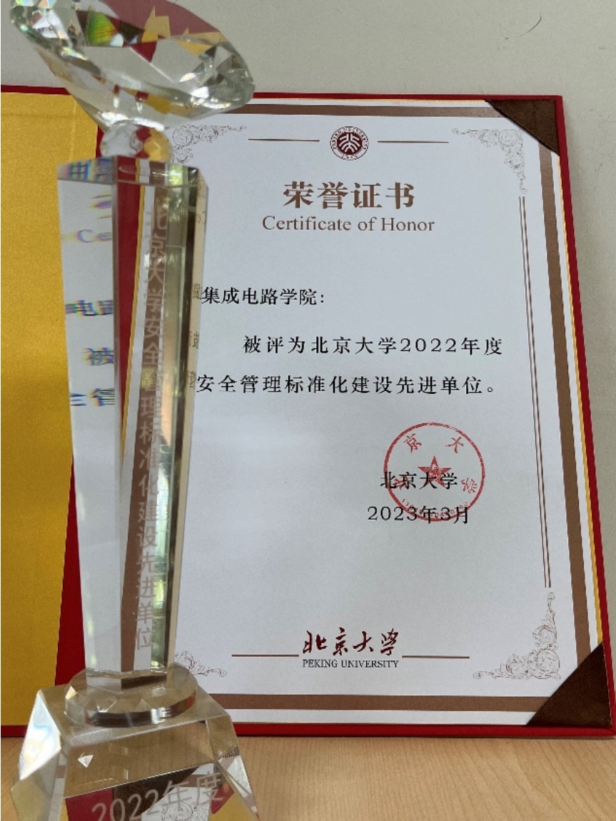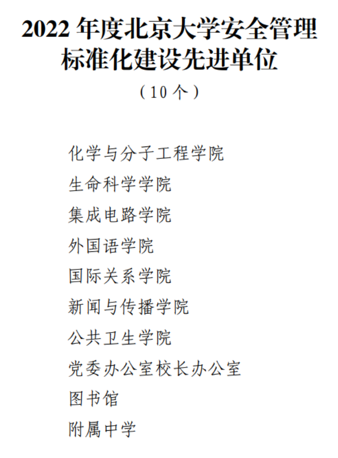 被评为北京大学2022年度北京大学安全管理标准化建设先进单位,贾嵩、崔健、姜博岩及刘鹏4位老师被评为北京大学2022年度安全管理先进个人。