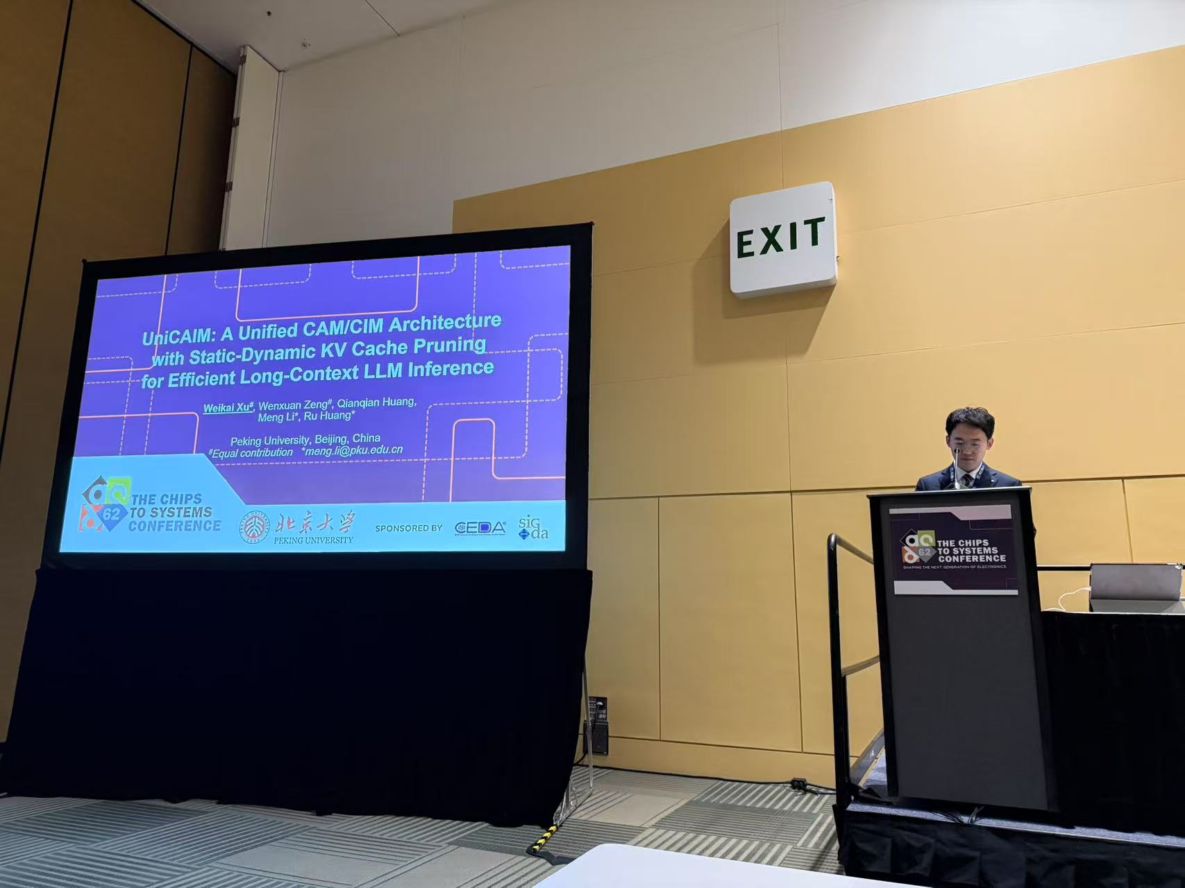 基于Transformer架构的大语言模型(LLM)在自然语言处理任务中取得了显著成功,但是在对话系统、内容创作和文档摘要等需要处理超长序列的应用中,LLM的推理受限于KV缓存(KV cache)的高存储和计算开销,现有的基于存内计算加速器尽管引入了KV cache剪枝技术,但仅支持固定的静态剪枝或者动态剪枝,导致精度下降或者计算能效受限。针对上述调整,通过算法和硬件协同设计优化,提出支持动静态KV cache剪枝的统一存内计算和搜索架构(UniCAIM),并基于新型非易失性存储器FeFET硬件实现,可以实现O(1)时间复杂度的高效动态KV cache剪枝,以及基于积累相似度分数的灵活静态KV cache剪枝,在电路层相比现有存内计算加速器降低8.2∼831倍的面积-能量-延迟乘积,同时在应用层保持与稠密注意力计算相当的高精度,展现了其在长上下文LLM推理中的巨大潜力。该工作以《UniCAIM: A Unified CAM/CIM Architecture with Static-Dynamic KV Cache Pruning for Efficient Long-Context LLM Inference》为题发表(北京大学博士生徐伟凯和硕士生曾文轩为共同第一作者,黄如教授和李萌研究员为共同通讯作者)。