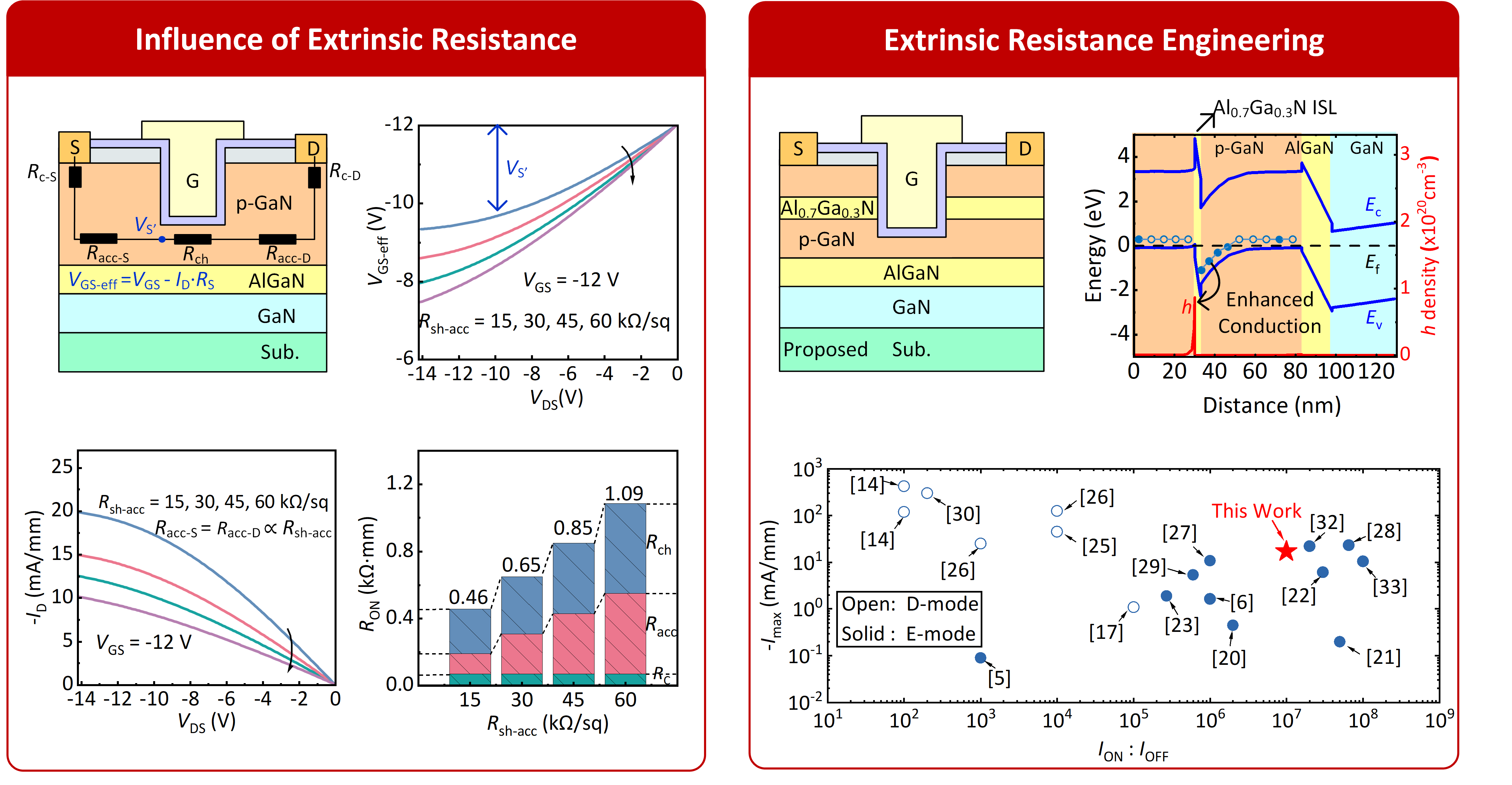 北京大学魏进团队研究发现源极电阻对电流密度具有重要的影响。首先,研究团队通过TCAD仿真发现源极电阻降低器件沟道处的有效栅压,从而降低器件电流密度和增大器件的沟道电阻。为优化器件源极电阻从而提升电学性能,该团队通过在器件接入区域插入一层Al0.7Ga0.3N,利用电离增强的方案有效...