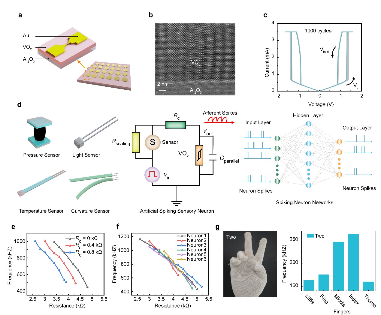 黄如院士-杨玉超教授课题组首次提出了一种基于外延VO2忆阻器的可校准感知神经元,用于解决人工感知神经元的一致性问题以及神经元与不同传感器阻抗匹配的问题。在材料层面上,外延生长的VO2高质量薄膜显著提高了人工神经元的周期间(cycle-to-cycle)一致性;在电路层面上,通过在神经元电路中引入校准电阻,有效调控了神经元的发放频率曲线,从而进一步提高了不同神经元之间(device-to...