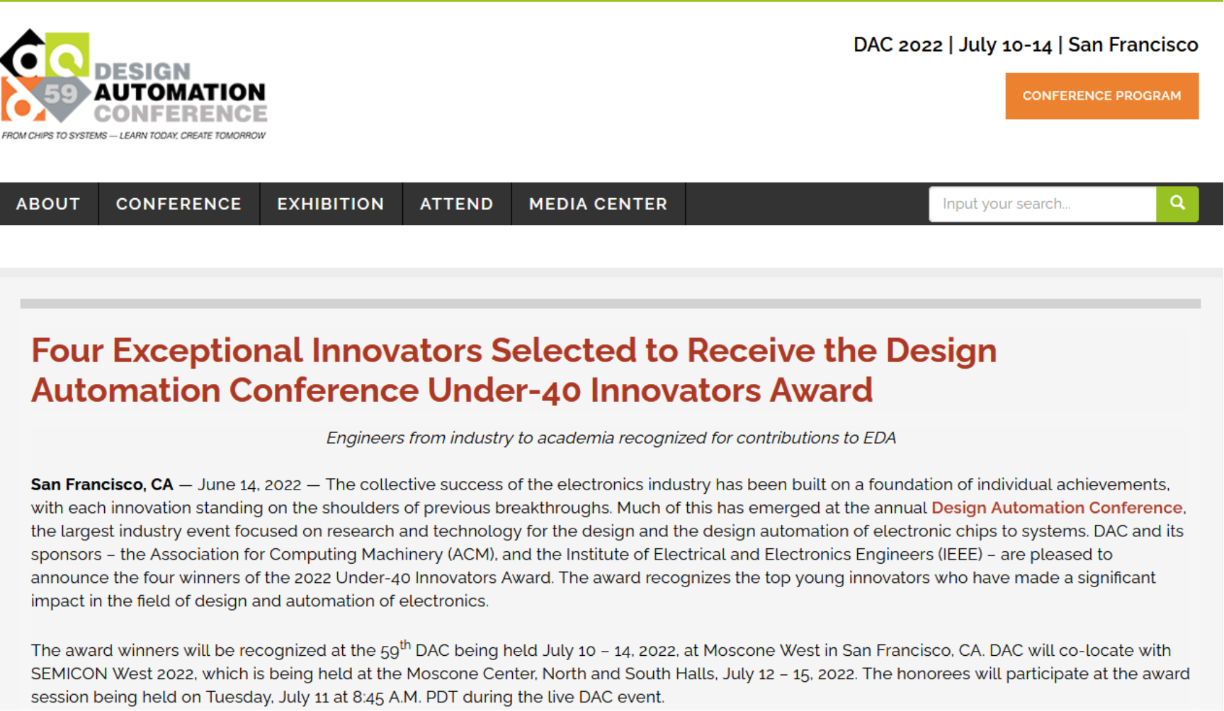 DAC设立“40岁以下创新者奖”,旨在表彰在电子设计与自动化领域内具备重要影响力及推动力的年轻科研人员。该奖项的提名面向全球学术界和工业界的优秀科研人员,着重选出在商业产品、软硬件系统、算法与工具等方面获得广泛应用的突出成果。