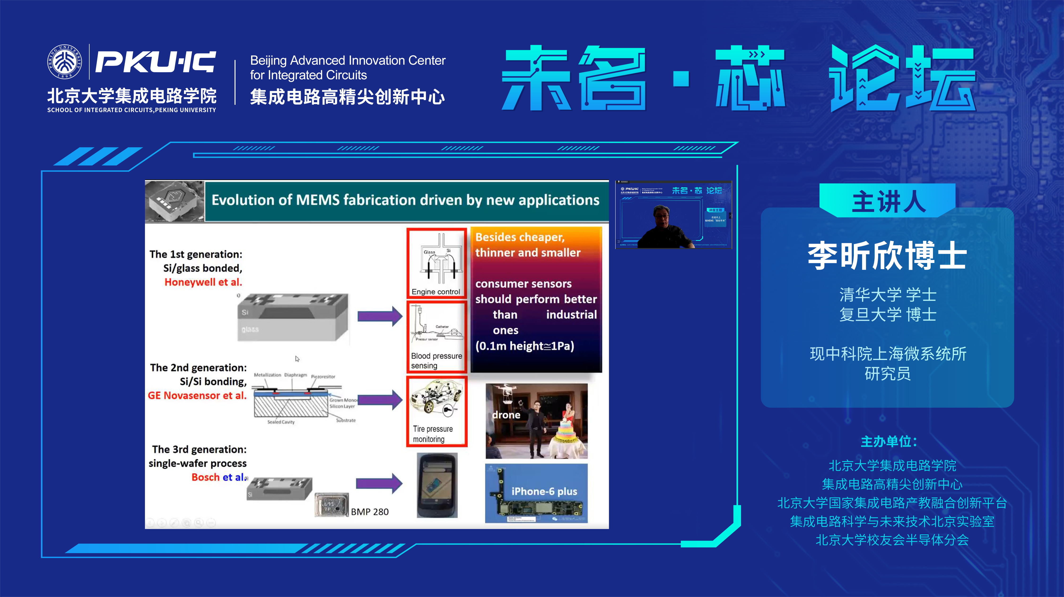 、集成电路高精尖创新中心、北京大学国家集成电路产教融合创新平台、集成电路科学与未来技术北京实验室、北京大学校友会半导体分会联合主办。此次邀请到中科院上海微系统所的李昕欣研究员为与会师生带来主题为“在硅片上做MEMS‘微创手术’”的报告。讲座由集成电路院李志宏教授主持,120余人线上参加。