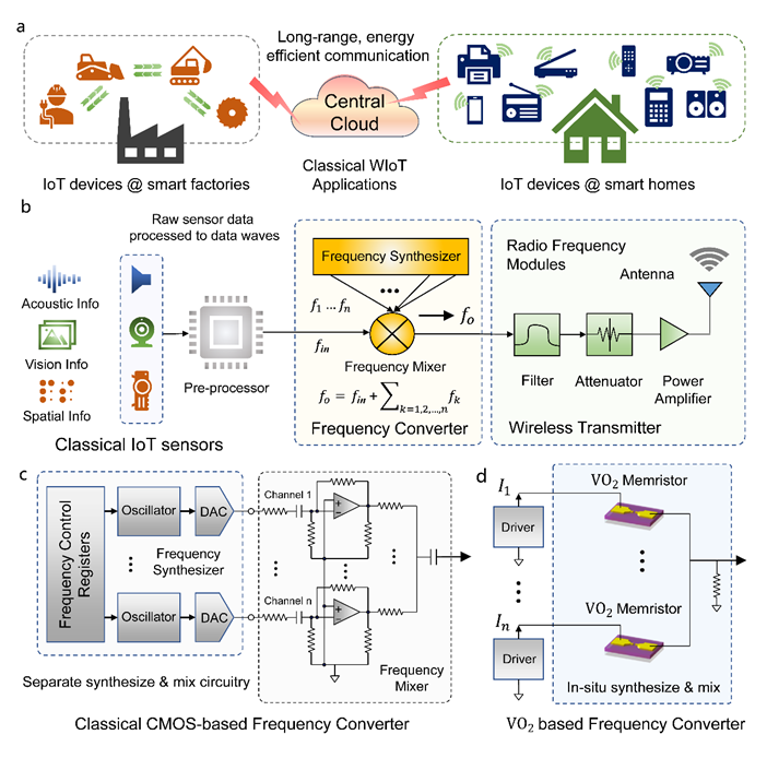 无线物联网(WIoT)在智慧工厂、智能家居及安防监控等各种应用中越来越受到重点关注。与传统网络相比,WIoT无需电缆或物理连接,易于设置并减少了对人工干预的需求,有助于大大提高生产力、降低成本,同时提高用户使用的满意度。现代化的WIoT硬件既可以利用较高频率实现近距离高速数据交互,也可以在相对较低的频率实现传感数据与边缘或云处理中心的远距传输。频率生成与混合是实现高效率无线传输中极为关键的步骤;然而,现有的频率生成与混合模块通常采用独立的生成与混合电路,基于传统的互补金属氧化物半导体(CMOS)器件,使用寄存器、环形振荡器、数模转换器和运算放大器等复杂数字和模拟电路,同时未面向较低频的WIoT传输链路进行针对性设计,天然的产生较高延迟和能耗。