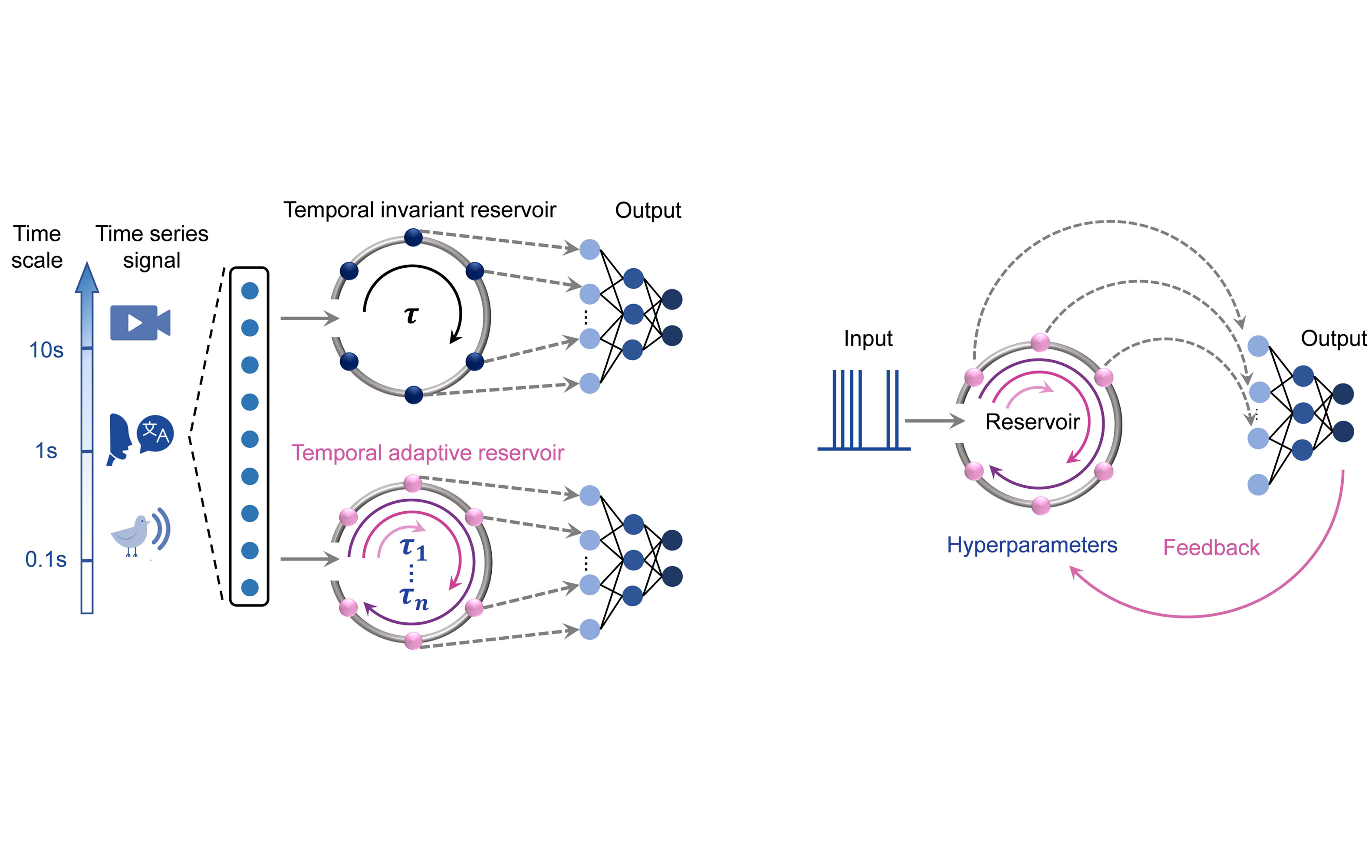 随着人工智能和物联网技术的高速发展,电子设备产生的数据、尤其是包含时空信息的数据呈爆炸式增长,循环神经网络在处理这一类数据方面有显著的独特优势。然而,RNN复杂的内部连接关系带来了沉重的存储开销,连同梯度消失和梯度爆炸等问题,使得它面临着训练难度大、硬件成本高的挑战。作为传统RNN的一种变体,储备池计算(Reservoir Computing)用相对固定的非线性储备池替代了复杂的循环互连结构,大大降低了训练和实现成本。目前储备池计算已被成功应用于动作模式识别、语音识别、气象预测等重要领域。储备池一个关键物理参数是其时间特性,会以高度任务特异性的方式显著影响系统的性能。这意味着针对不同任务需要有针对性地调控储备池。但与之相反地,当前实现物理储备池的电子器件往往被用作一个“黑盒子”,特性由制备工艺决定,通常不具备适应性。这一局限使得大多数已被报道的储备池计算系统只能完成与特定物理器件时间尺度相匹配的任务,极大地限制其应用。