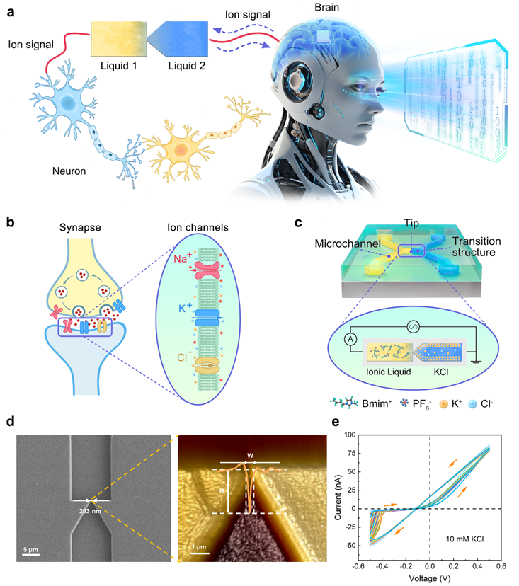 与人工智能不同,生物智能采用离子作为信号载体,以神经突触和神经元为大脑的基本功能单元。通过化学神经递质和离子通道,生物智能可以实现各种生理过程。这种计算机制使得人脑能够迅速处理复杂的非线性问题,展现出卓越的性能。离子电子学利用多种离子作为信号载体,能够携带丰富的生物兼容性信息,可直接在非生物与生物系统之间实现多种离子信号与电信号的转换,有望打破非生物界面与生物界面之间的信息壁垒,在神经修复、脑机接口及混合人工智能等领域展现出广阔的应用潜力。然而,如何在与生物突触动作电位相近的低工作电压下实现仿生突触的关键特性、并实现晶圆级制造,仍是一大挑战。